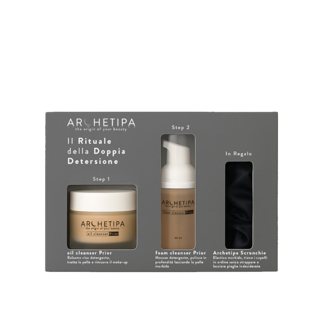 Il Rituale della Doppia Detersione in formato Travel Size, con scrunchie in raso in regalo.